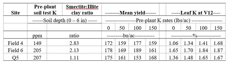 Table 1. Soil analysis of K, smectite and illite clay ratios, and mean yields and leaf K concentration of corn in response to potassium fertilizer application on three fields at the Carrington REC.