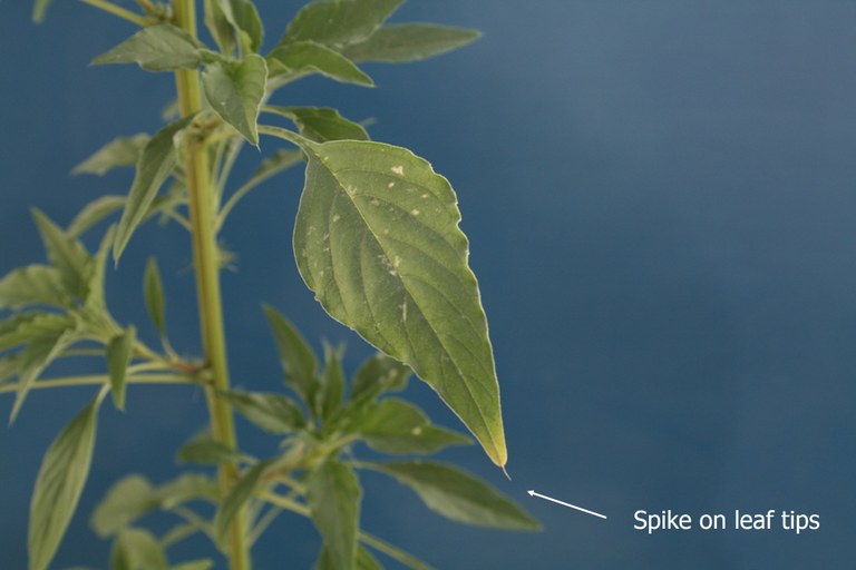 One key identifying characteristic of Palmer amaranth that distinguishes it from waterhemp is the long petiole, or stem, that attaches the leaf to the main stem. The petiole is quite a bit longer than the leaf blade. The leaves often have a small spike at the tip.