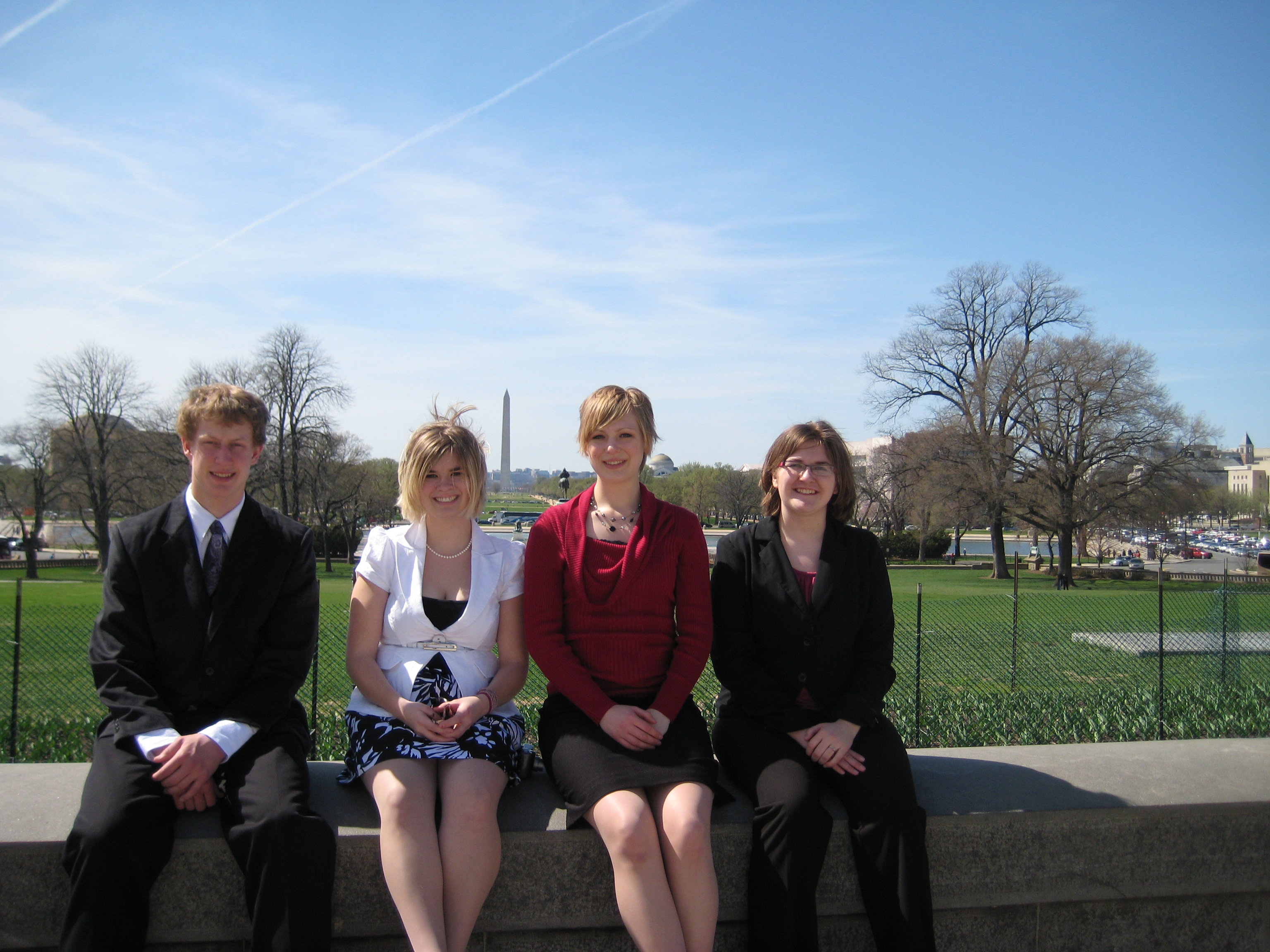 North Dakota 4-H members take a break while on a tour in Washington, D.C. They are, from left, Jason Jallo of Fordville, Rebecca O'Toole of Crystal, Hannah Klinnert of Kindred and Sophie Miller of Adrian.https://www.ag.ndsu.edu/news/newsreleases/2010/april-19-2010/n-d-youth-attend-national-4-h-conference/north-dakota-4-h-members-take-a-break-while-on-a-tour-in-washing/viewhttps://www.ag.ndsu.edu/news/newsreleases/2010/april-19-2010/n-d-youth-attend-national-4-h-conference/north-dakota-4-h-members-take-a-break-while-on-a-tour-in-washing/@@download/image/2010-04-22.8543718180
