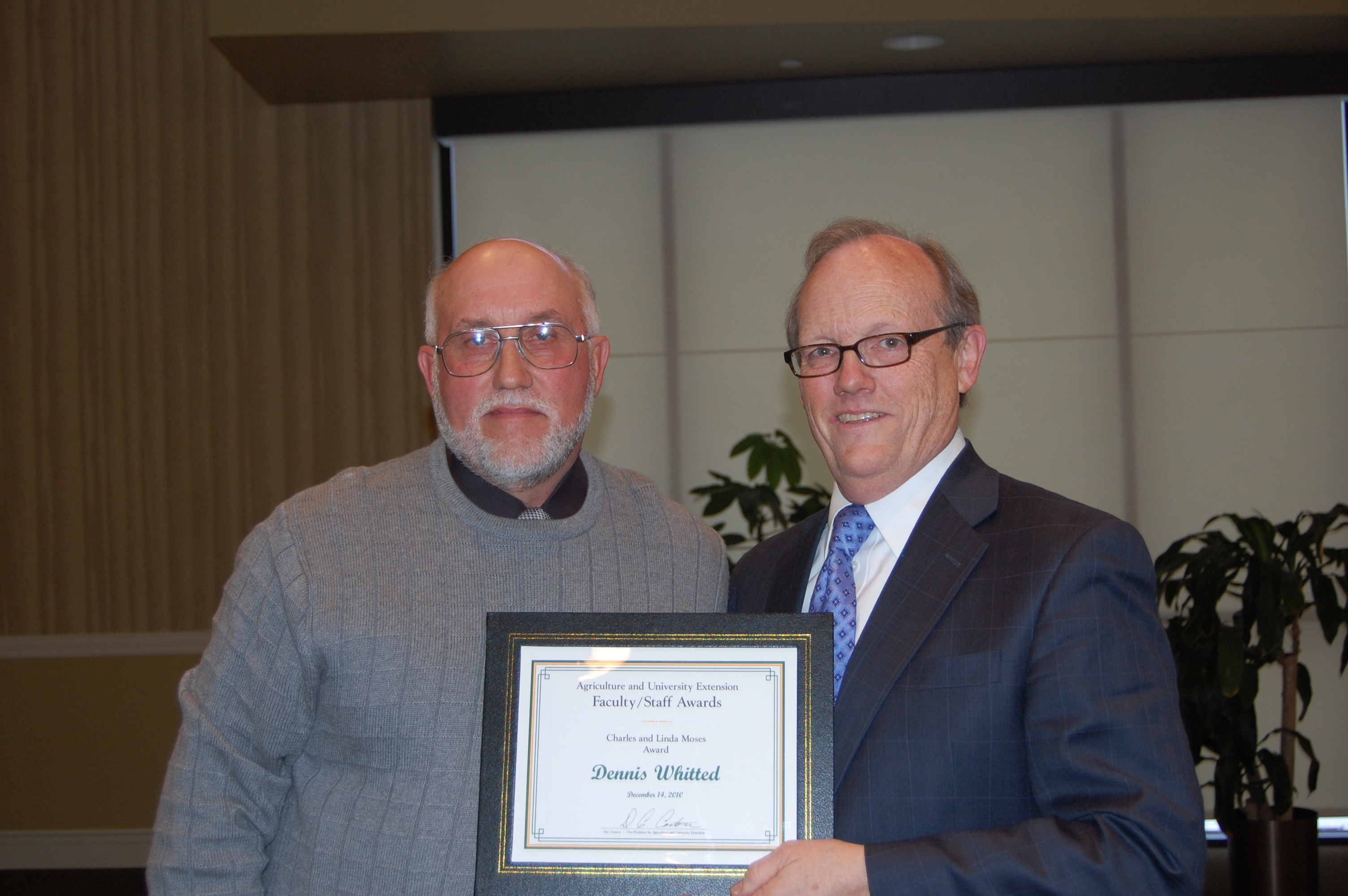 Dennis Whitted, left, research specialist in the NDSU School of Natural Resource Sciences (Range Science), receives the Charles and Linda Moses Staff Award from D.C. Coston, vice president for Agriculture and University Extension.https://www.ag.ndsu.edu/news/newsreleases/2010/dec-13-2010/ndsu-agriculture-extension-faculty-and-staff-honored/dennis-whitted-left-research-specialist-in-the-ndsu-school-of-na/viewhttps://www.ag.ndsu.edu/news/newsreleases/2010/dec-13-2010/ndsu-agriculture-extension-faculty-and-staff-honored/dennis-whitted-left-research-specialist-in-the-ndsu-school-of-na/@@download/image/2010-12-16.7433317683