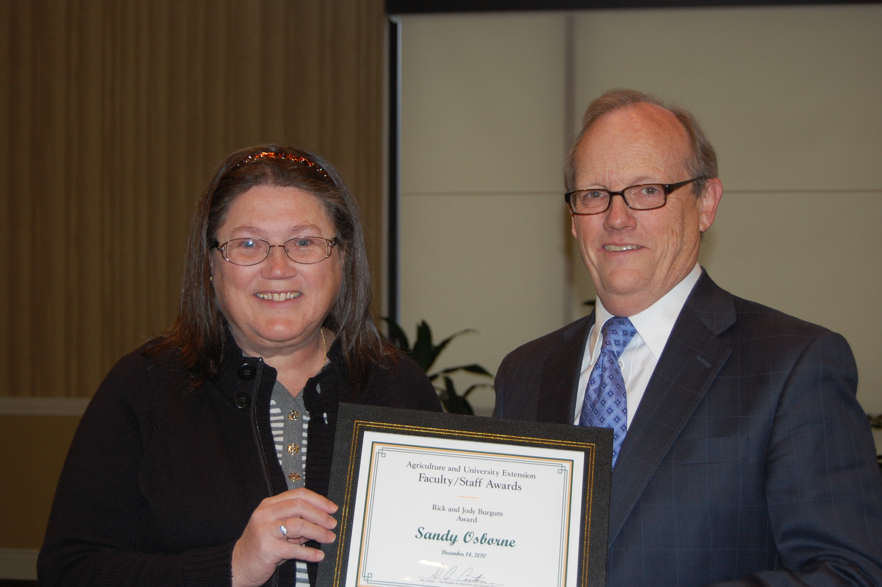 Sandy Osborne, administrative coordinator in the Agribusiness and Applied Economics Department, receives the Rick and Jody Burgum Staff Award from D.C. Coston, vice president for Agriculture and University Extension.https://www.ag.ndsu.edu/news/newsreleases/2010/dec-13-2010/ndsu-agriculture-extension-faculty-and-staff-honored/sandy-osborne-administrative-coordinator-in-the-agribusiness-and/viewhttps://www.ag.ndsu.edu/news/newsreleases/2010/dec-13-2010/ndsu-agriculture-extension-faculty-and-staff-honored/sandy-osborne-administrative-coordinator-in-the-agribusiness-and/@@download/image/2010-12-16.9168438054
