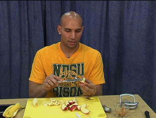 Bison basketball team member Freddy Coleman demonstrates how to make a quick, easy-to-prepare, healthful snack for kids.