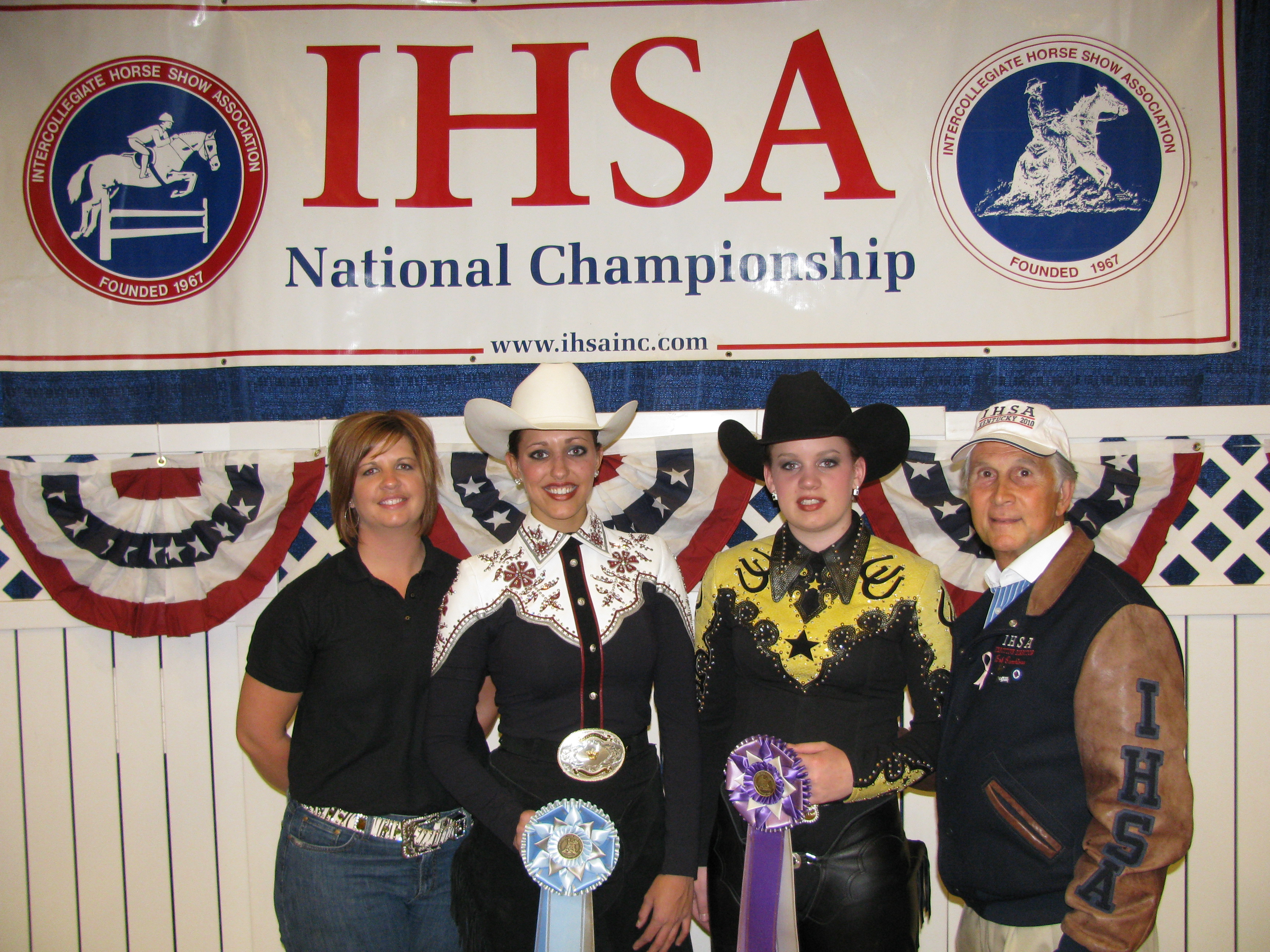 Two members of NDSU's equestrian team display the ribbons they received at the Intercollegiate Horse Show Association's national horse show in Lexington, Ky. Pictured are, from left: team coach Tara Swanson, junior Sara Holman, freshman Juliann Zach and IHSA founder Bob Cacchione.https://www.ag.ndsu.edu/news/newsreleases/2010/june-1-2010/ndsu-riders-place-in-national-competition/two-members-of-ndsu-s-equestrian-team-display-the-ribbons-they-r/viewhttps://www.ag.ndsu.edu/news/newsreleases/2010/june-1-2010/ndsu-riders-place-in-national-competition/two-members-of-ndsu-s-equestrian-team-display-the-ribbons-they-r/@@download/image/2010-06-01.0953336484