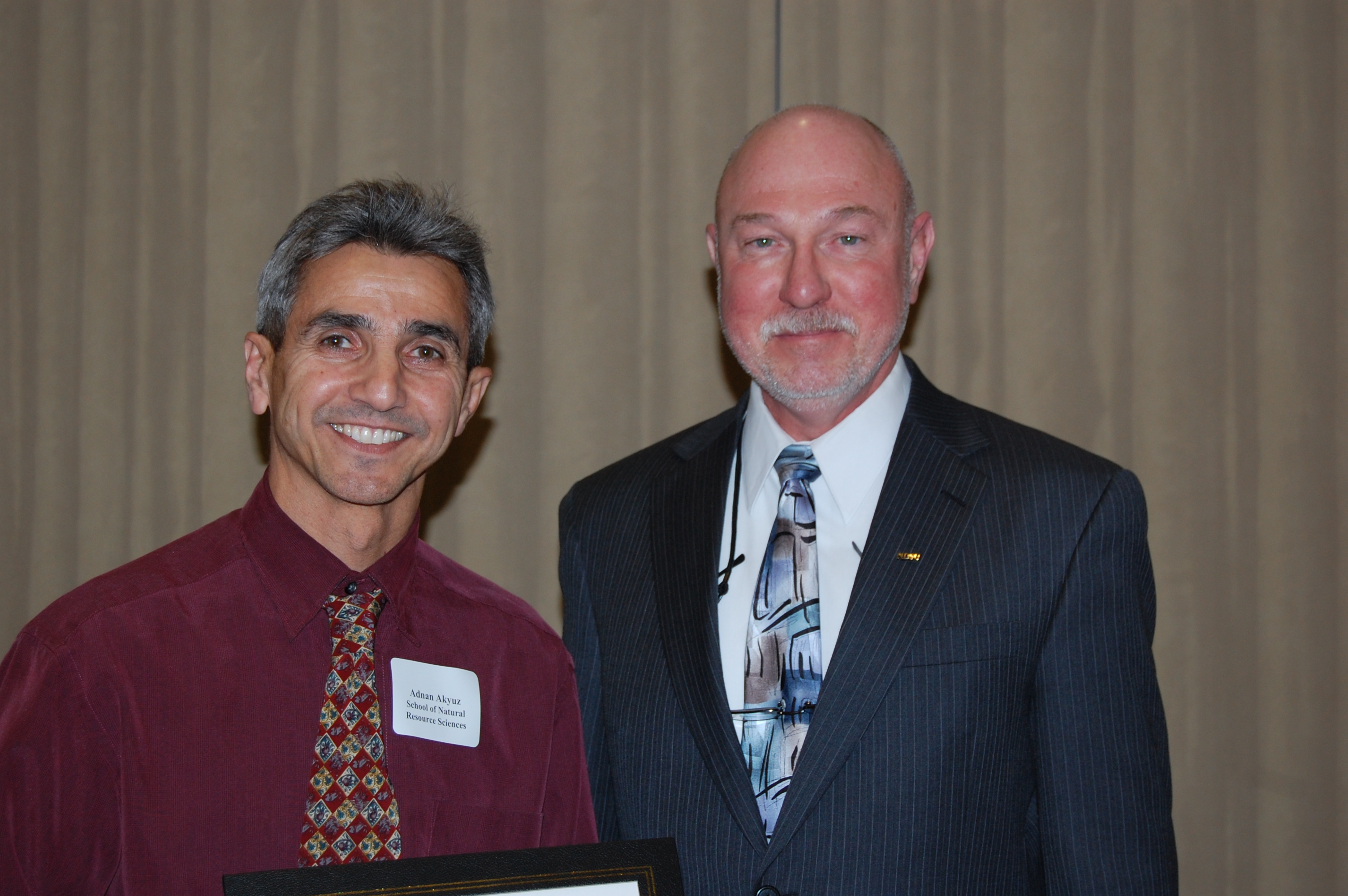 Adnan Akyuz (left) receives the Earl and Dorothy Foster Excellence in Teaching Award from Ken Grafton, vice president for Agriculture and University Extension.