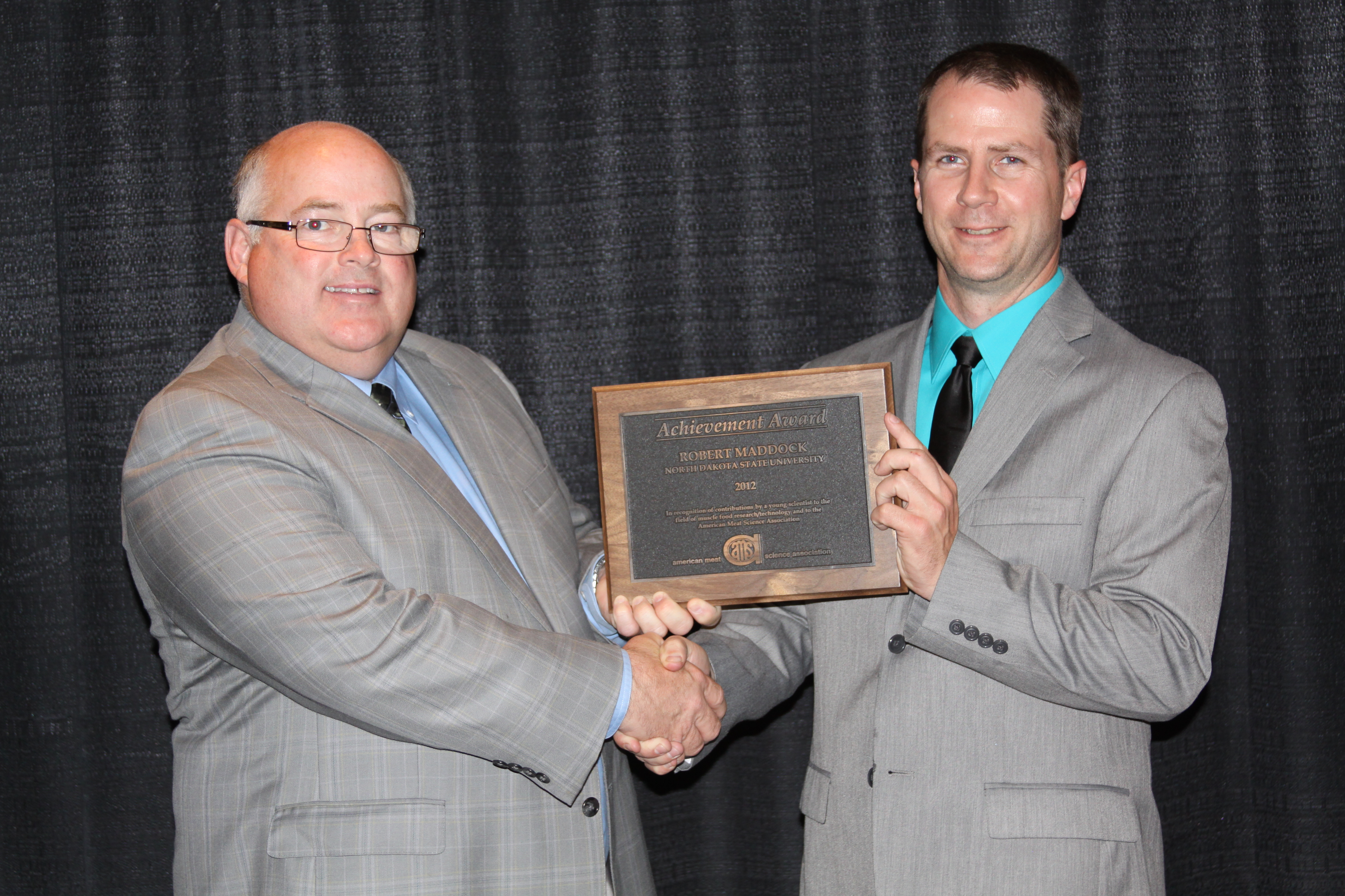 Robert Maddock (right), an associate professor in NDSU's Animal Sciences Department, receives the American Meat Science Association's Distinguished Achievement Award from Casey Frye, the association's treasurer and vice president for research and development at Burke Corp., the award's sponsor.https://www.ag.ndsu.edu/news/newsreleases/2012/june-25-2012/maddock-receives-meat-science-award/robert-maddock-right-an-associate-professor-in-ndsu-s-animal-sci/viewhttps://www.ag.ndsu.edu/news/newsreleases/2012/june-25-2012/maddock-receives-meat-science-award/robert-maddock-right-an-associate-professor-in-ndsu-s-animal-sci/@@download/image/2012-06-25.7384145061