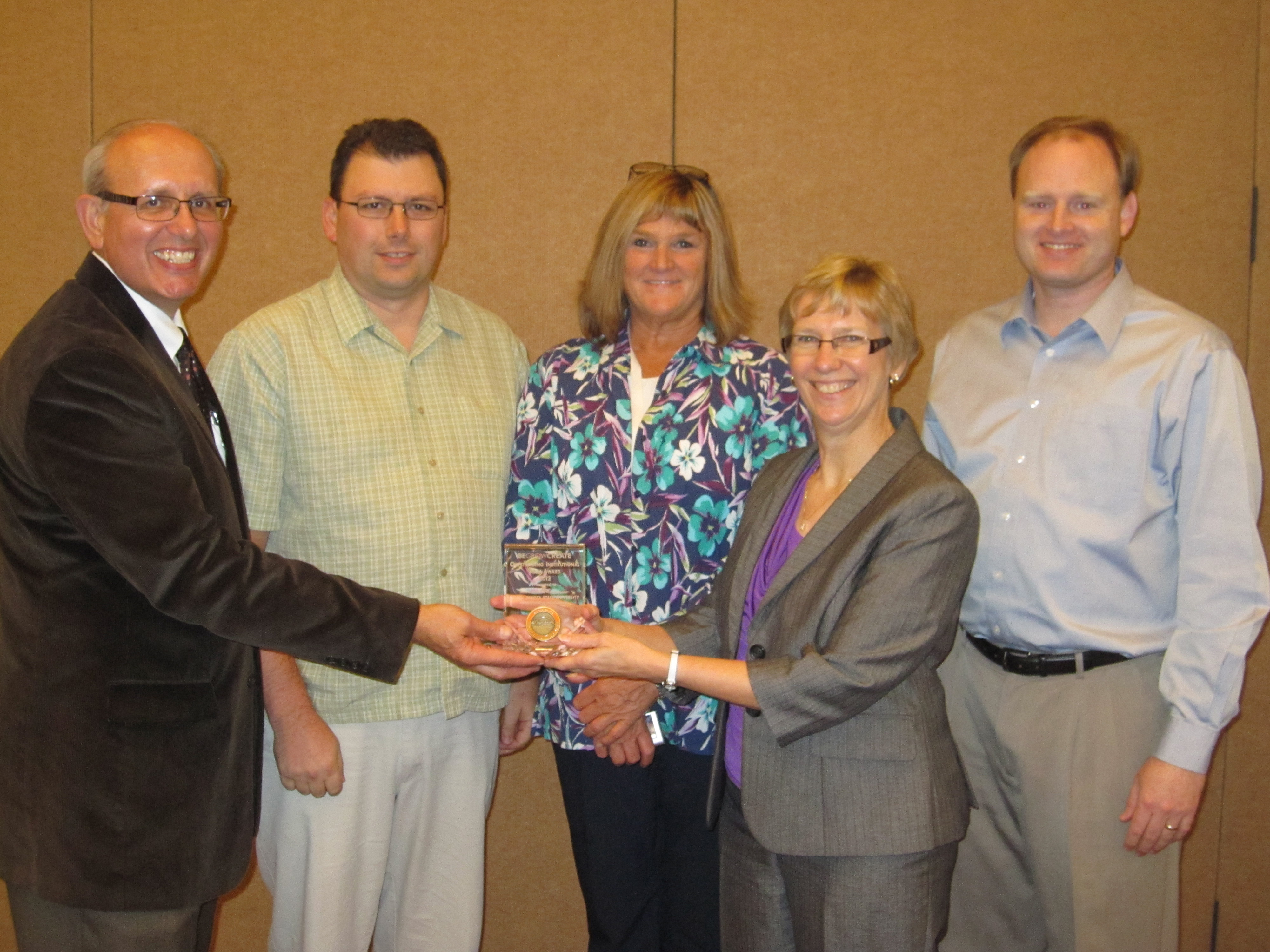 Jimmy Henning, Kentucky Cooperative Extension Service director (left), presents a Be, Grow, Create Outstanding Institutional Team Award to members of NDSU's eXtension institutional team. Team members receiving the award are (from left) Bob Bertsch, Ag Communication Web technology specialist; Debra Pankow, Human Development and Family Science assistant professor/Extension family economics specialist; Becky Koch, Ag Communication director; and Greg McKee, Agribusiness and Applied Economics associate professor and Quentin Burdick Center for Cooperatives director.https://www.ag.ndsu.edu/news/newsreleases/2012/nov-19-2012/ndsu-extension-team-honored/jimmy-henning-kentucky-cooperative-extension-service-director-le/viewhttps://www.ag.ndsu.edu/news/newsreleases/2012/nov-19-2012/ndsu-extension-team-honored/jimmy-henning-kentucky-cooperative-extension-service-director-le/@@download/image/2012-11-19.3411386944