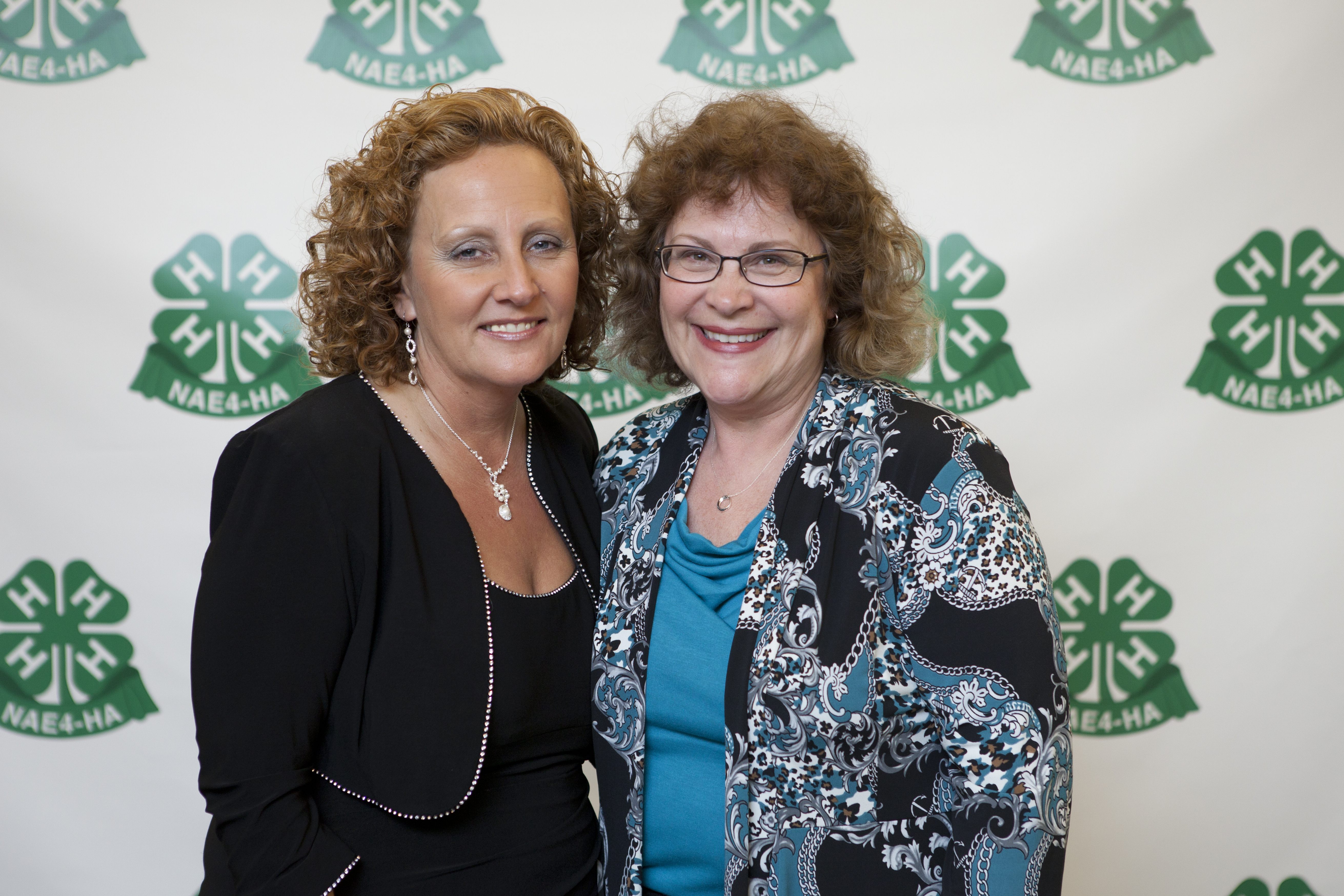 Peggy Anderson, right, receives congratulations from Debbie Nistler, president of the National Association of Extension 4-H Agents, for receiving the Meritorious Service Award.
