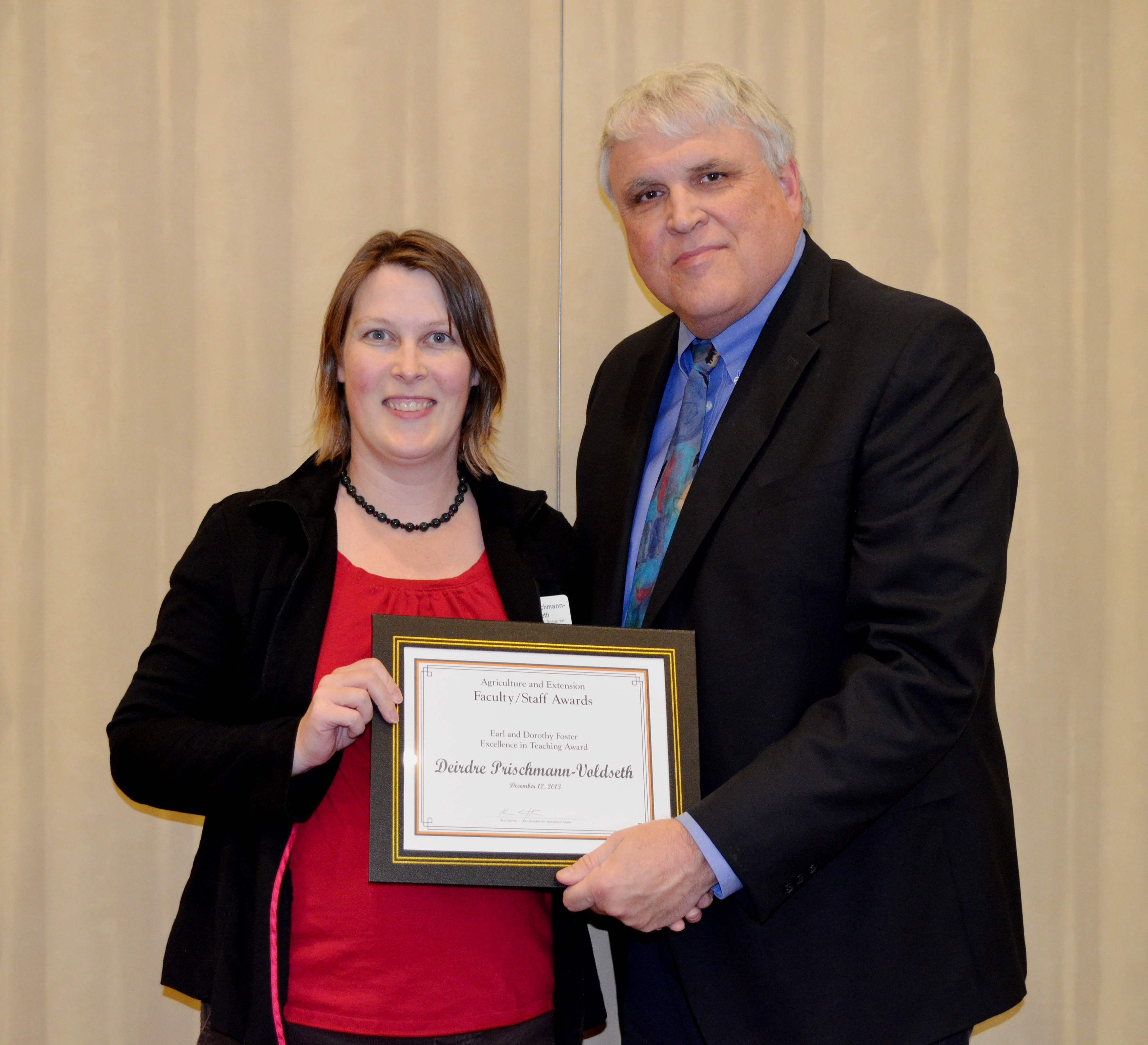 Deirdre Prischmann-Voldseth, assistant professor, School of Natural Resource Sciences (Entomology Department) receives the Earl and Dorothy Foster Excellence in Teaching Award from David Buchanan, associate dean for academic programs in the College of Agriculture, Food Systems, and Natural Resources.https://www.ag.ndsu.edu/news/newsreleases/2013/dec-9-2013/ndsu-agriculture-extension-faculty-and-staff-honored/deirdre-prischmann-voldseth-assistant-professor-school-of-natura/viewhttps://www.ag.ndsu.edu/news/newsreleases/2013/dec-9-2013/ndsu-agriculture-extension-faculty-and-staff-honored/deirdre-prischmann-voldseth-assistant-professor-school-of-natura/@@download/image/2013-12-13.8132290846
