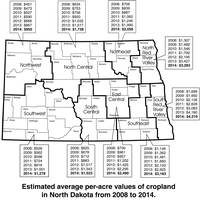 Land values in the northern Red River Valley region showed a 4 percent decline (to $3,283) from January 2013 to January 2014 after a 56 percent increase the previous year. All other regions had positive year-to-year results, with the lowest being 3 percent (to $4,319) in the southern Red River Valley counties and (to $2,058) in the northeastern region.