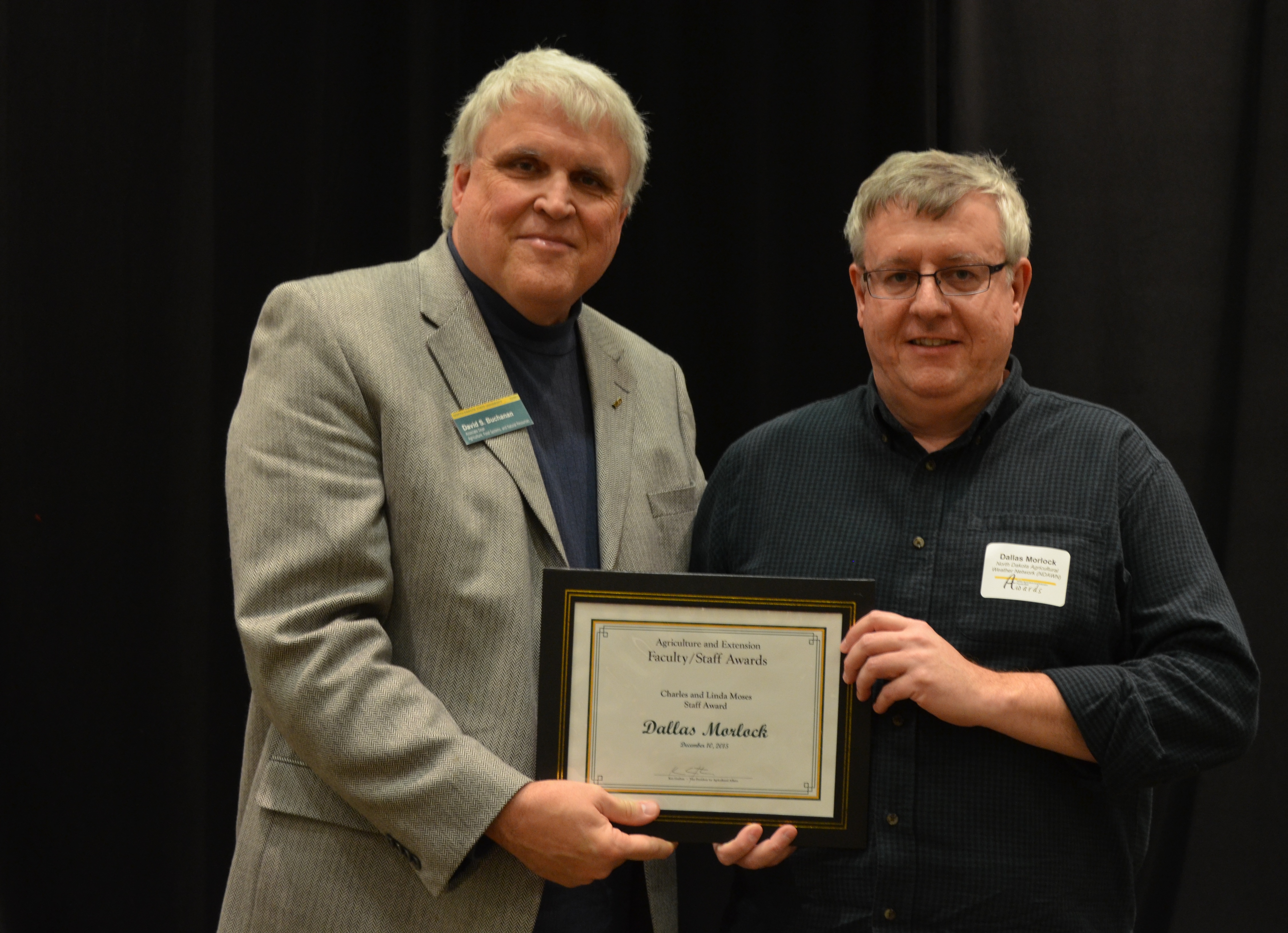 David Buchanan, associate dean for academic programs in the College of Agriculture, Food Systems, and Natural Resources (left), presents the Charles and Linda Moses Staff Award to Dallas Morlock, computer programmer, North Dakota Agricultural Weather Network. (NDSU photo)https://www.ag.ndsu.edu/news/newsreleases/2015/dec-7-2015/ndsu-agriculture-extension-faculty-and-staff-honored/david-buchanan-associate-dean-for-academic-programs-in-the-colle-5/viewhttps://www.ag.ndsu.edu/news/newsreleases/2015/dec-7-2015/ndsu-agriculture-extension-faculty-and-staff-honored/david-buchanan-associate-dean-for-academic-programs-in-the-colle-5/@@download/image/2015-12-10.7628127584