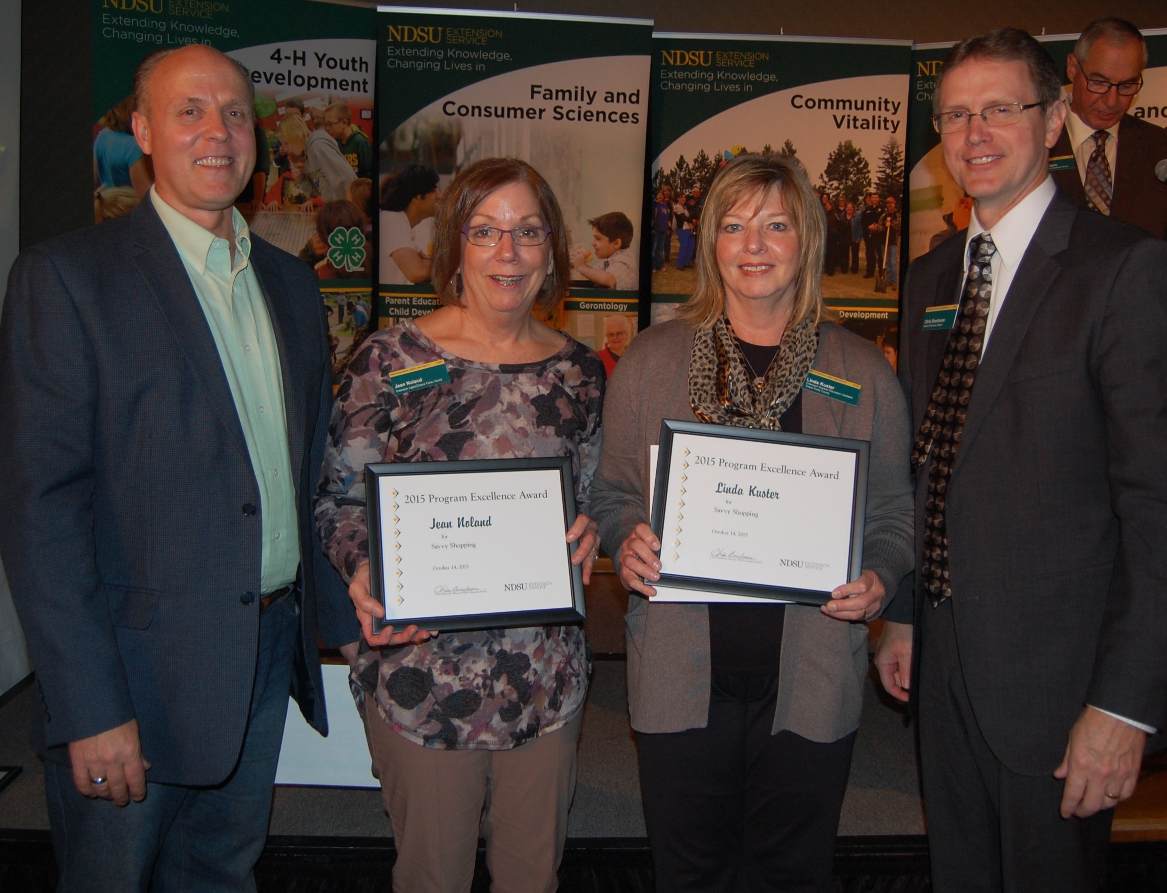 Patrick Sitter (far left), general manager, Farm and Ranch Guide, and Chris Boerboom, NDSU Extension Service director, present a Program Excellence Award to Jean Noland (second from left), Extension agent, Expanded Food and Nutrition Education Program, Grand Forks County; and Linda Kuster, nutrition education assistant, Family Nutrition Program, Grand Forks County, for the Savvy Shopping program. (NDSU photo)https://www.ag.ndsu.edu/news/newsreleases/2015/oct-12-2015/ndsu-extension-teams-recognized-for-work/patrick-sitter-far-left-general-manager-farm-and-ranch-guide-and/viewhttps://www.ag.ndsu.edu/news/newsreleases/2015/oct-12-2015/ndsu-extension-teams-recognized-for-work/patrick-sitter-far-left-general-manager-farm-and-ranch-guide-and/@@download/image/2015-10-16.1583332232