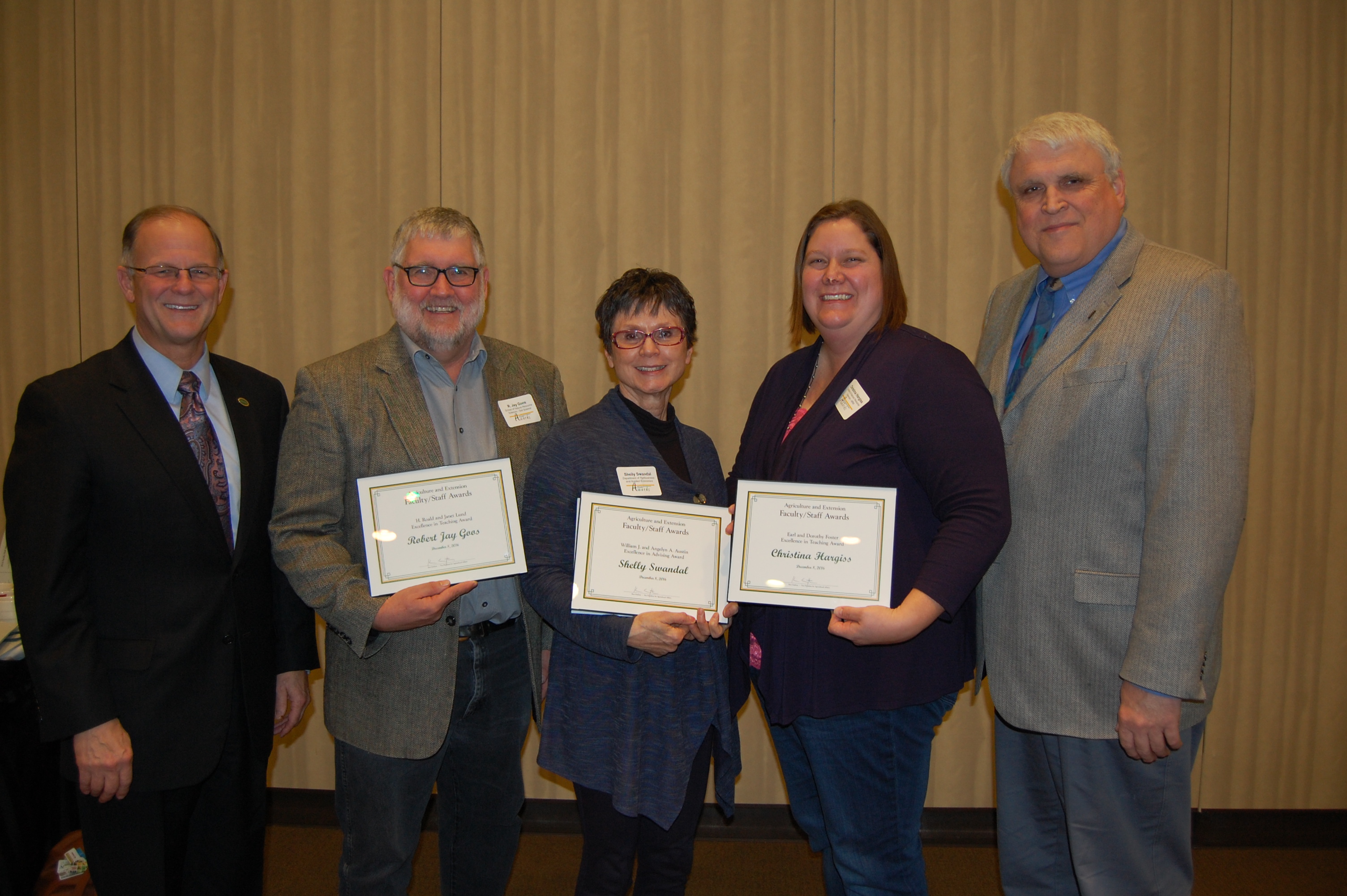NDSU faculty were honored for their teaching and advising during the 25th annual Agriculture and Extension Faculty/Staff Awards program Dec. 8. Pictured are, from left, NDSU President Dean Bresciani; R.Jay Goos, professor, School of Natural Resource Sciences (Soil Science); Shelly Swandal, student services director, Department of Agribusiness and Applied Economics; Christina Hargiss, assistant professor, School of Natural Resource Sciences (Natural Resources Management); and David Buchanan, associate dean for academic programs in the College of Agriculture, Food Systems, and Natural Resources. (NDSU photo)https://www.ag.ndsu.edu/news/newsreleases/2016/dec-5-2016/ndsu-agriculture-extension-faculty-and-staff-honored/ndsu-faculty-were-honored-for-their-teaching-and-advising-during/viewhttps://www.ag.ndsu.edu/news/newsreleases/2016/dec-5-2016/ndsu-agriculture-extension-faculty-and-staff-honored/ndsu-faculty-were-honored-for-their-teaching-and-advising-during/@@download/image/2016-12-08.0036351948