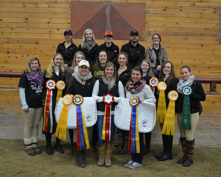 NDSU's hunt seat team wins its first regional high-point team title. Pictured are (from left, front row): Rebecca Prasch, Mattia Gunkelman (coach), Bryn Halley; (middle row) Sarah Jilka, Kayla Young, Erin Thelander, Lauren Ciernia, Bridget Kackos, Hailey Aagard, Morgan Samuelson, Samantha Stoel; (back row) Kara Berntson, Dana Williams, Madysen Offerman, Nick Scarberry and Emma Ballard. (NDSU photo)https://www.ag.ndsu.edu/news/newsreleases/2016/march-7-2016/ndsu-hunt-seat-riders-advance-to-zone-competition/ndsu-s-hunt-seat-team-wins-its-first-regional-high-point-team-ti/viewhttps://www.ag.ndsu.edu/news/newsreleases/2016/march-7-2016/ndsu-hunt-seat-riders-advance-to-zone-competition/ndsu-s-hunt-seat-team-wins-its-first-regional-high-point-team-ti/@@download/image/2016-03-07.9320353854