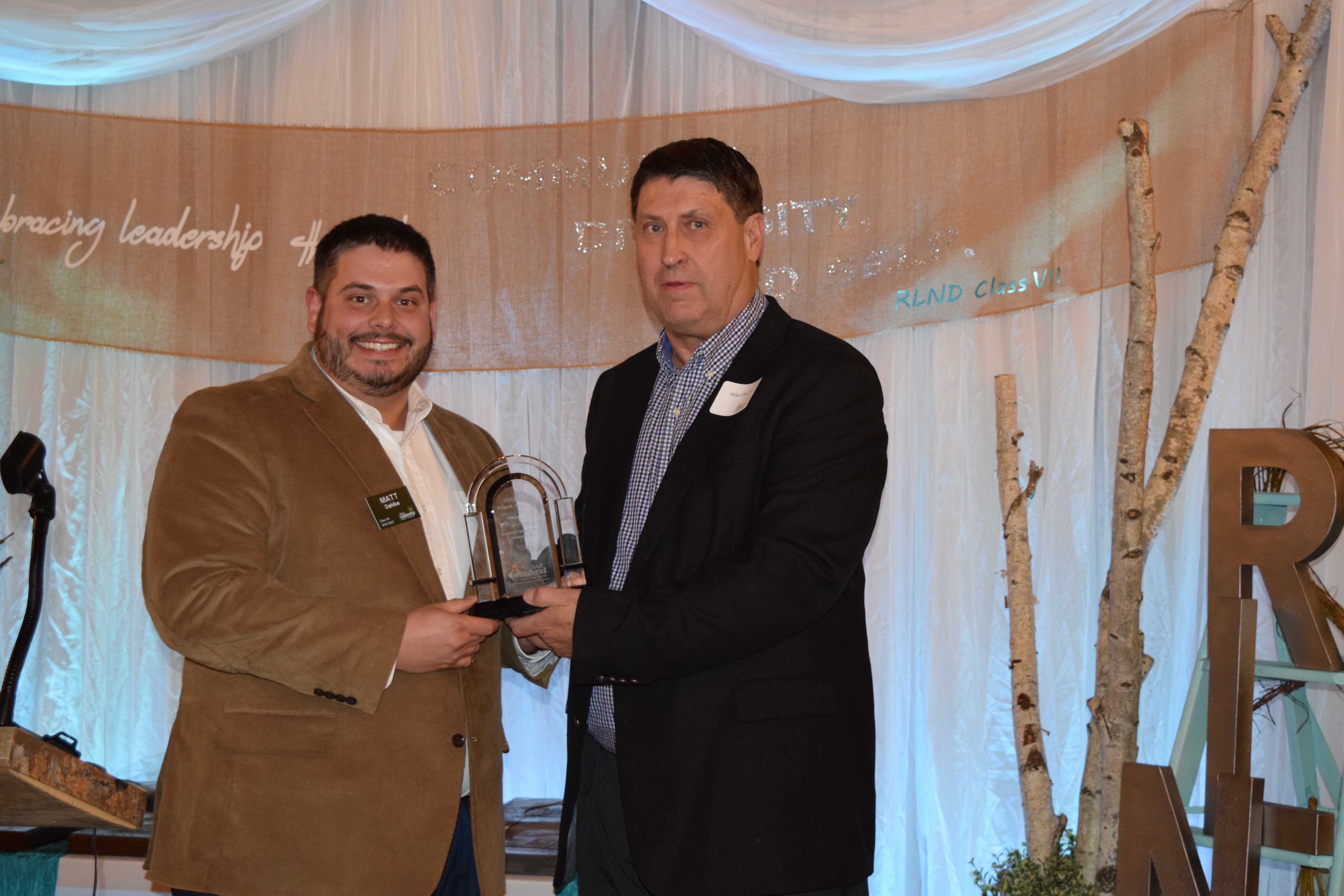 RLND Council chairman Mike O'Keeffe, right, presents Matt Dahlke, loan officer for Farm Credit Services of Mandan, with the RLND Champion Award that FCSM was honored with during the RLND Class VII graduation gala. (NDSU photo)