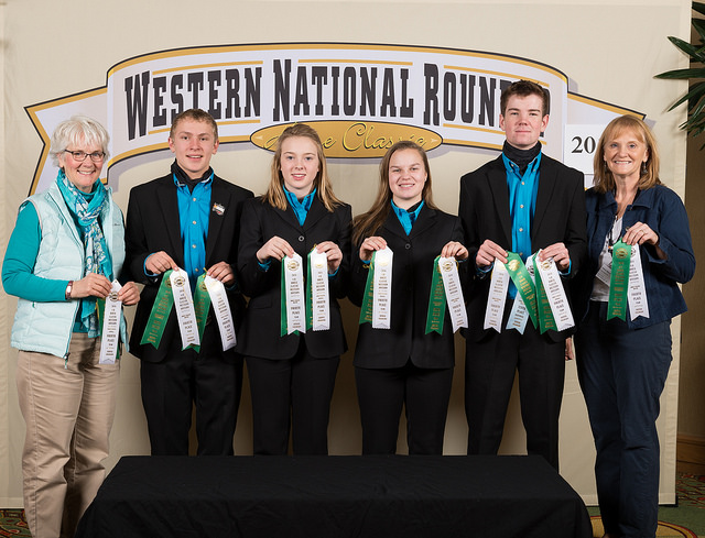 The Benson County horse judging team places fourth at the Western National Roundup in Denver, Colo. Pictured are, from left: coach Barb Rice; team members Jacob Arnold, Marit Wang, Ashton Wold and Will Rice; and coach Diane Randle. (Photo courtesy of Adam Warren Photography)https://www.ag.ndsu.edu/news/newsreleases/2017/jan-30-2017/n-d-4-h-teams-place-at-western-national-roundup/the-benson-county-horse-judging-team-places-fourth-at-the-wester/viewhttps://www.ag.ndsu.edu/news/newsreleases/2017/jan-30-2017/n-d-4-h-teams-place-at-western-national-roundup/the-benson-county-horse-judging-team-places-fourth-at-the-wester/@@download/image/2017-02-02.4236952085