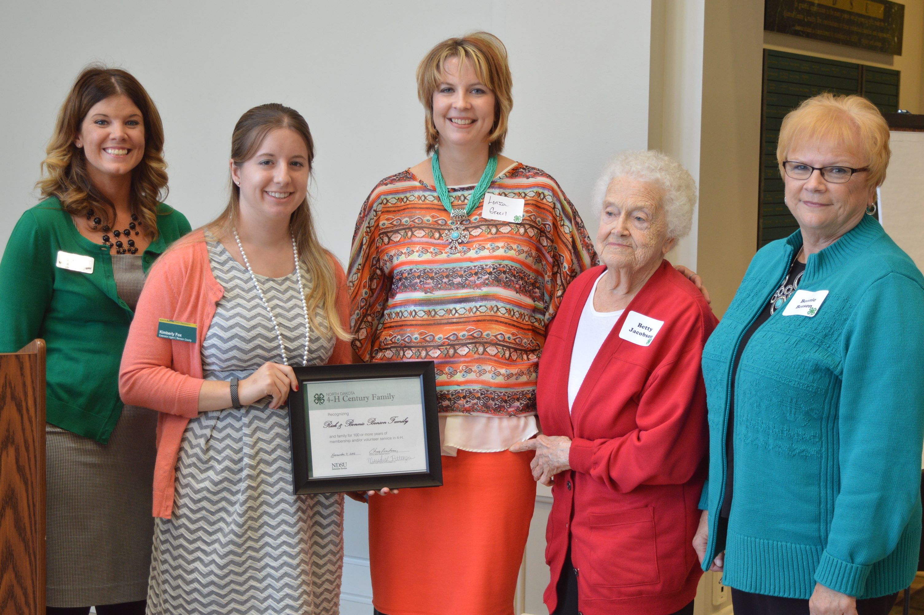 The Benson/Jacobson family of Benson County is named a 4-H century family. Pictured are, from left: Meredith Pittenger, formerly of the North Dakota 4-H Foundation; Kimberly Fox, NDSU Extension Service agent in Benson County; Lorissa Green; Betty Jacobson and Bonnie Benson. (NDSU photo)https://www.ag.ndsu.edu/news/newsreleases/2017/jan-30-2017/n-d-4-h-volunteers-century-families-honored/the-benson-jacobson-family-of-benson-county-is-named-a-4-h-centu/viewhttps://www.ag.ndsu.edu/news/newsreleases/2017/jan-30-2017/n-d-4-h-volunteers-century-families-honored/the-benson-jacobson-family-of-benson-county-is-named-a-4-h-centu/@@download/image/2017-02-03.3411862062
