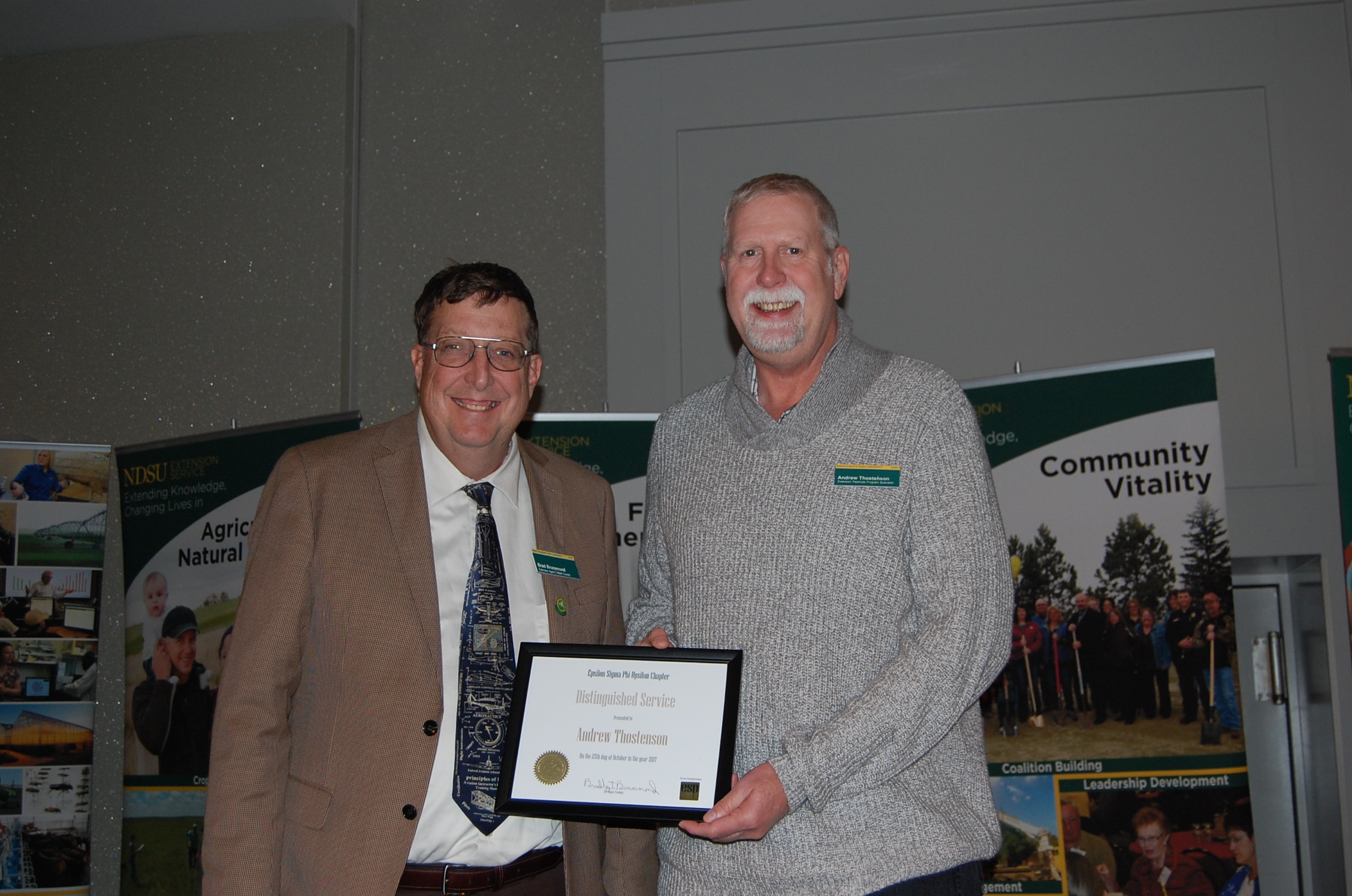 Andrew Thostenson (right) receives the Distinguished Service Award from Brad Brummond, an agent in NDSU Extension's Walsh County office and president of the Upsilon Chapter of Epsilon Sigma Phi. (NDSU photo)https://www.ag.ndsu.edu/news/newsreleases/2017/oct-30-2017/extension-honorary-organization-presents-awards/andrew-thostenson-right-receives-the-distinguished-service-award/viewhttps://www.ag.ndsu.edu/news/newsreleases/2017/oct-30-2017/extension-honorary-organization-presents-awards/andrew-thostenson-right-receives-the-distinguished-service-award/@@download/image/2017-10-30.2029317669