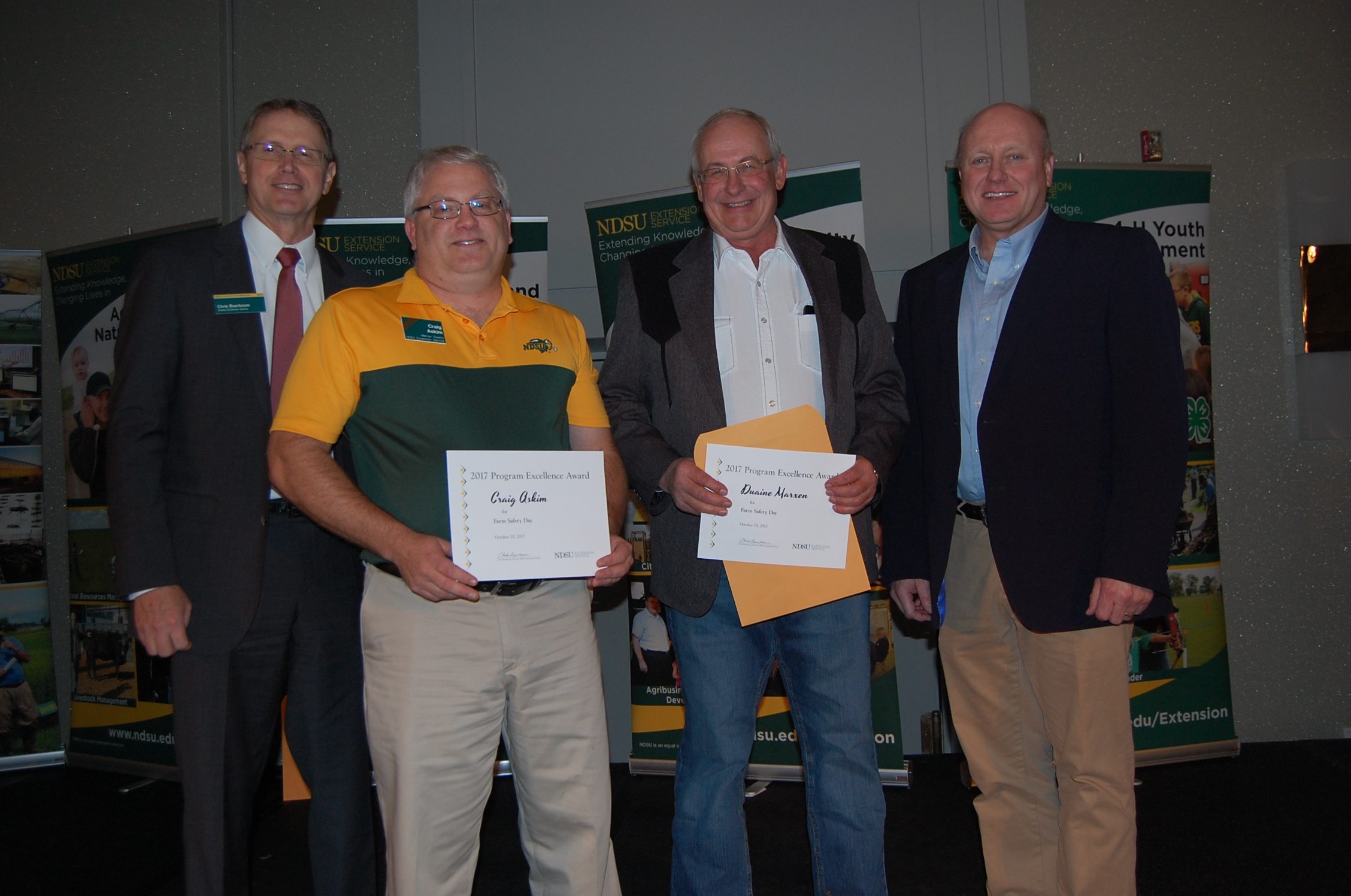 Extension agents Craig Askim, Mercer County (second from left), and Duaine Marxen, Hettinger County, receive a Program Excellence Award for Farm Saftey Day from NDSU Extension Director Chris Boerboom, left, and Jim Murphy, Farm and Ranch Guide (far right). (NDSU photo)https://www.ag.ndsu.edu/news/newsreleases/2017/oct-30-2017/ndsu-extension-teams-honored-for-program-excellence/extension-agents-craig-askim-mercer-county-second-from-left-and-/viewhttps://www.ag.ndsu.edu/news/newsreleases/2017/oct-30-2017/ndsu-extension-teams-honored-for-program-excellence/extension-agents-craig-askim-mercer-county-second-from-left-and-/@@download/image/2017-10-30.9973913650