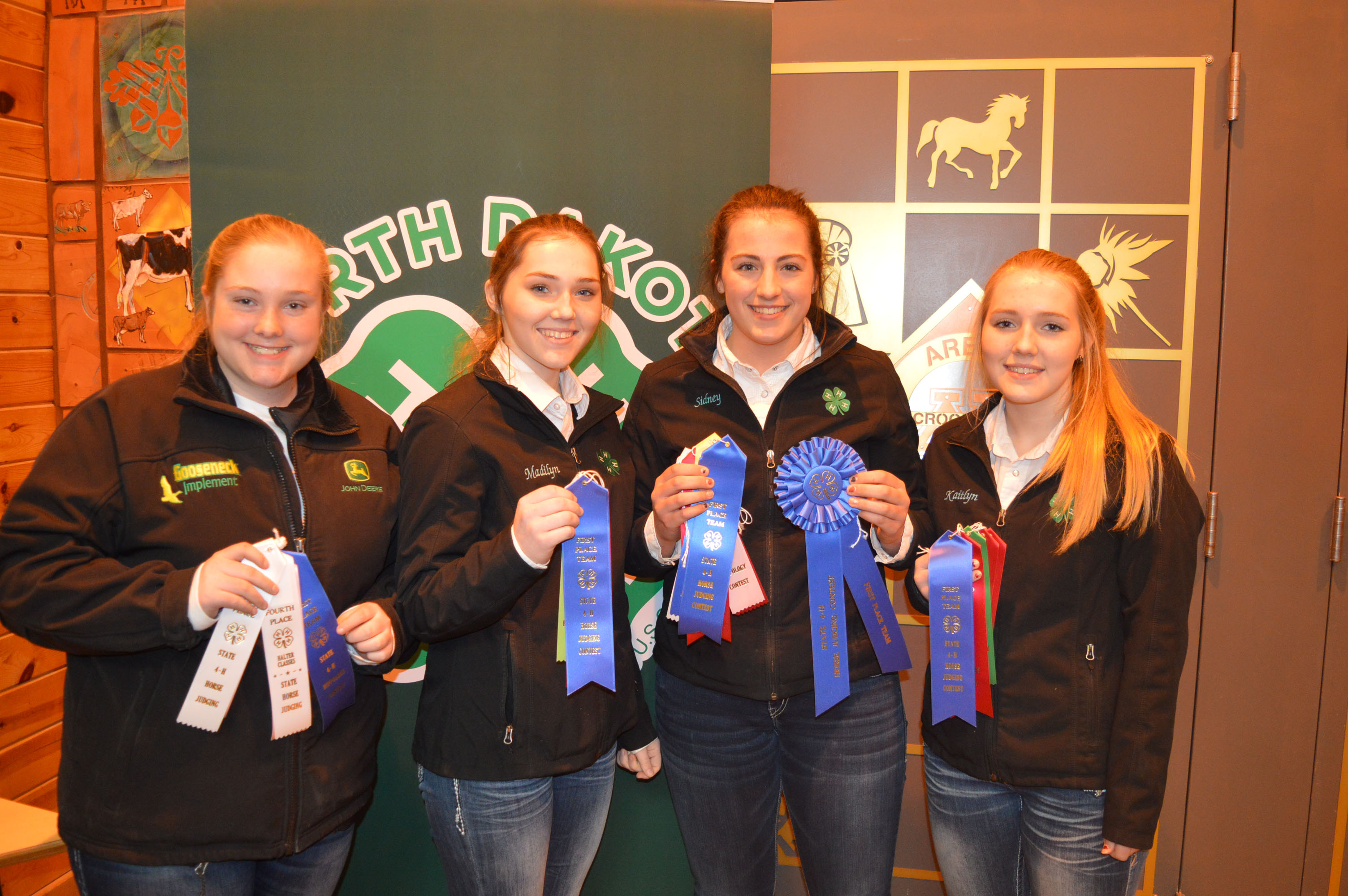 A Ward County team took first place in the senior division of horse judging. Pictured are (from left): team members Mariah Braasch, Madilyn Berg, Sidney Lovelace and Kaitlyn Berg. (NDSU photo)