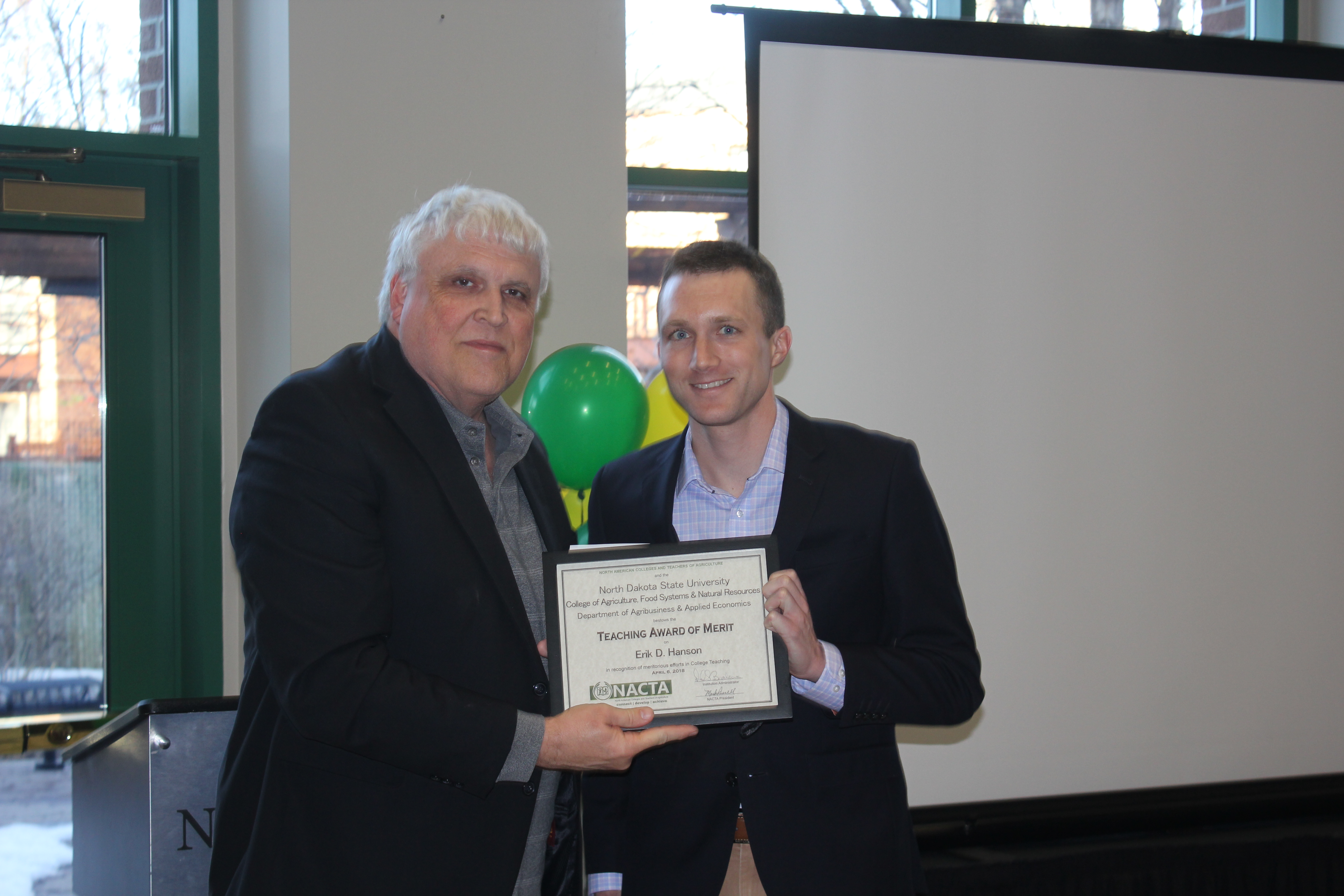 Erik Hanson, an assistant professor in NDSU's Agribusiness and Applied Economics Department (right), receives the North American Colleges and Teachers of Agriculture Teaching Award of Merit from David Buchanan, associate dean in NDSU's College of Agriculture, Food Systems, and Natural Resources. (NDSU photo)https://www.ag.ndsu.edu/news/newsreleases/2018/april-16-2018/ndsu-agribusiness-and-applied-economics-banquet-kicks-off-centennial-year/erik-hanson-an-assistant-professor-in-ndsu-s-agribusiness-and-ap/viewhttps://www.ag.ndsu.edu/news/newsreleases/2018/april-16-2018/ndsu-agribusiness-and-applied-economics-banquet-kicks-off-centennial-year/erik-hanson-an-assistant-professor-in-ndsu-s-agribusiness-and-ap/@@download/image/2018-04-17.7268208129