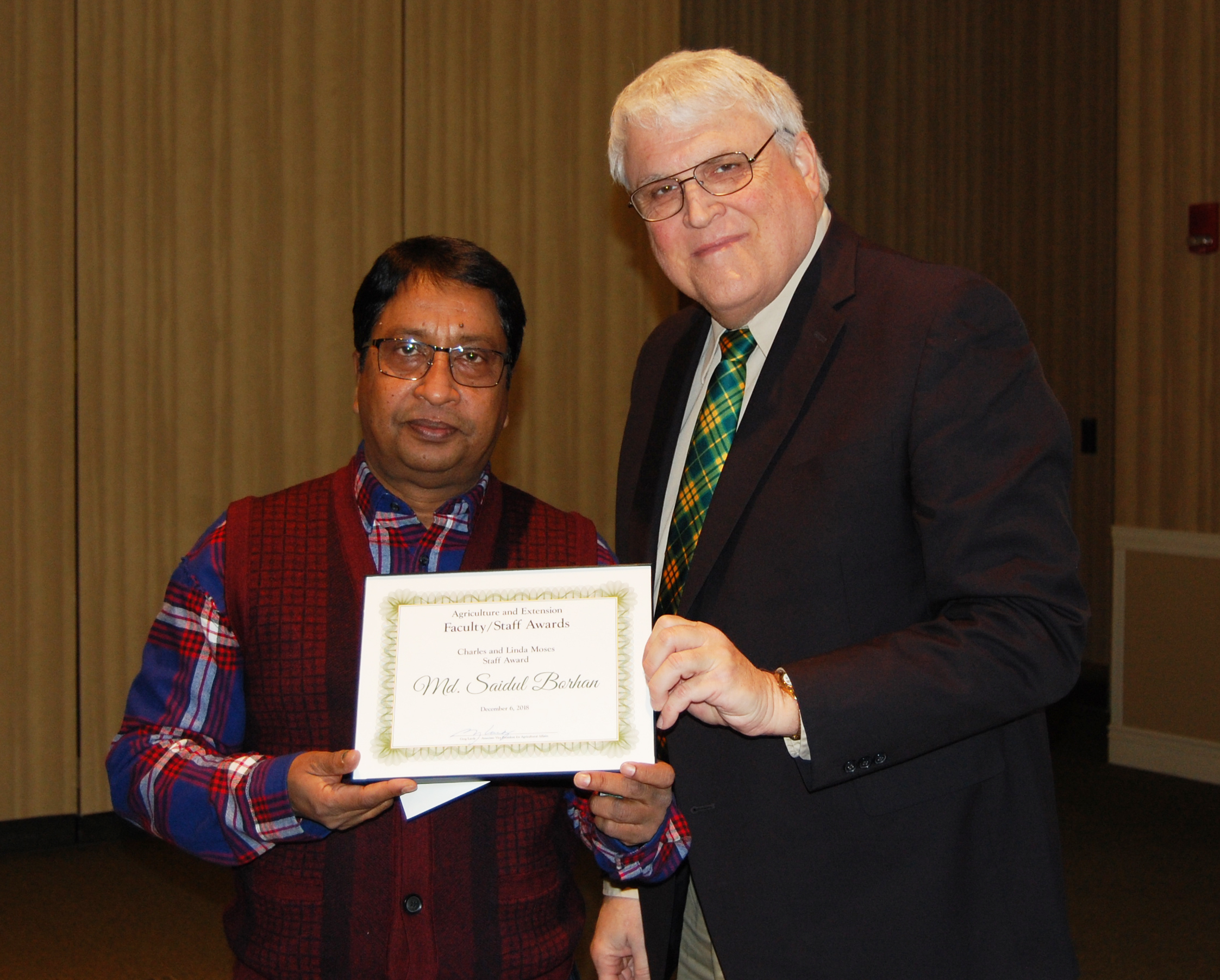 Md. Saidul Borhan, left, receives the Charles and Linda Moses Staff Award from David Buchanan, associate dean for academic programs. (NDSU photo)https://www.ag.ndsu.edu/news/newsreleases/2018/dec-3-2018/ndsu-agriculture-extension-faculty-and-staff-honored/md.saidul-borhan-left-receives-the-charles-and-linda-moses-staff/viewhttps://www.ag.ndsu.edu/news/newsreleases/2018/dec-3-2018/ndsu-agriculture-extension-faculty-and-staff-honored/md.saidul-borhan-left-receives-the-charles-and-linda-moses-staff/@@download/image/2018-12-06.0406677255
