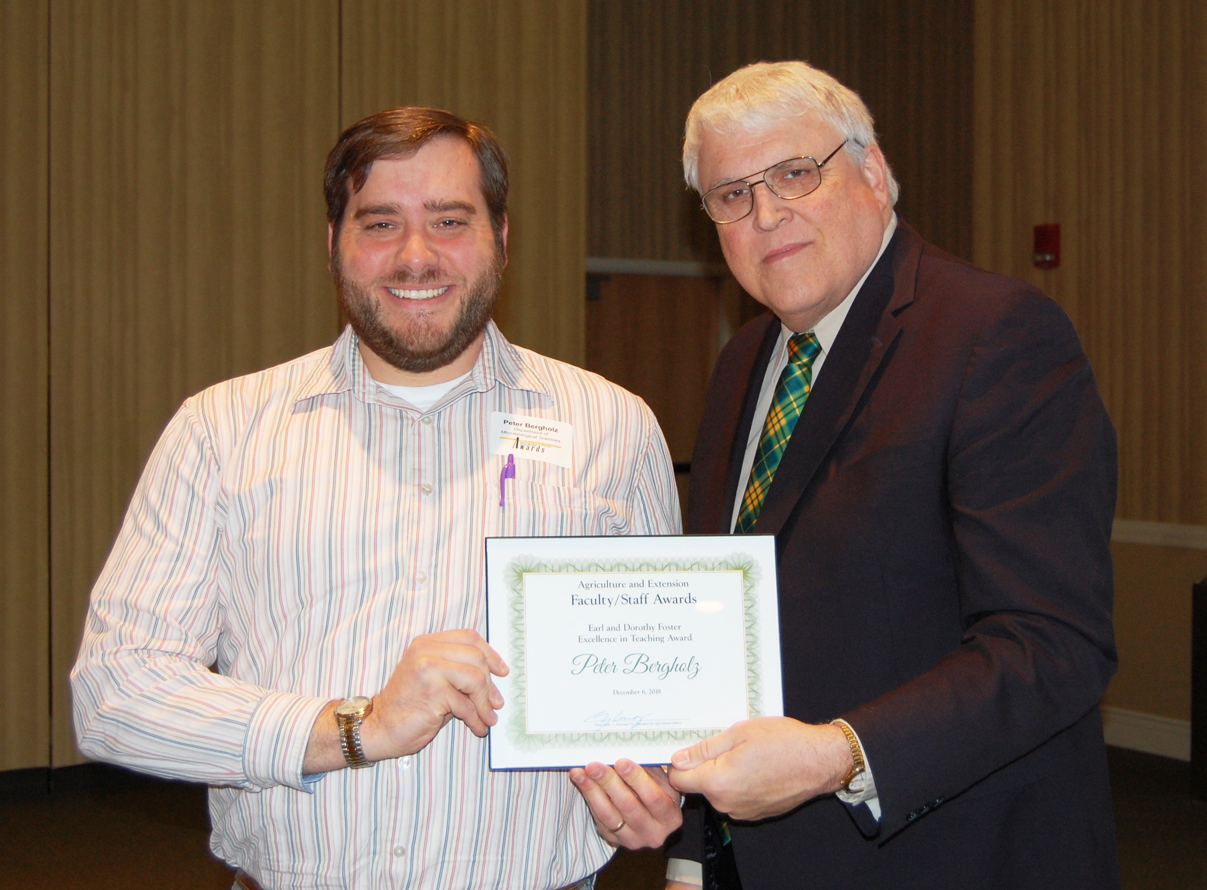 Peter Bergholz, left, receives the Earl and Dorothy Foster Excellence in Teaching Award from David Buchanan, associate dean for academic programs. (NDSU photo)https://www.ag.ndsu.edu/news/newsreleases/2018/dec-3-2018/ndsu-agriculture-extension-faculty-and-staff-honored/peter-bergholz-left-receives-the-earl-and-dorothy-foster-excelle/viewhttps://www.ag.ndsu.edu/news/newsreleases/2018/dec-3-2018/ndsu-agriculture-extension-faculty-and-staff-honored/peter-bergholz-left-receives-the-earl-and-dorothy-foster-excelle/@@download/image/2018-12-06.6964021002
