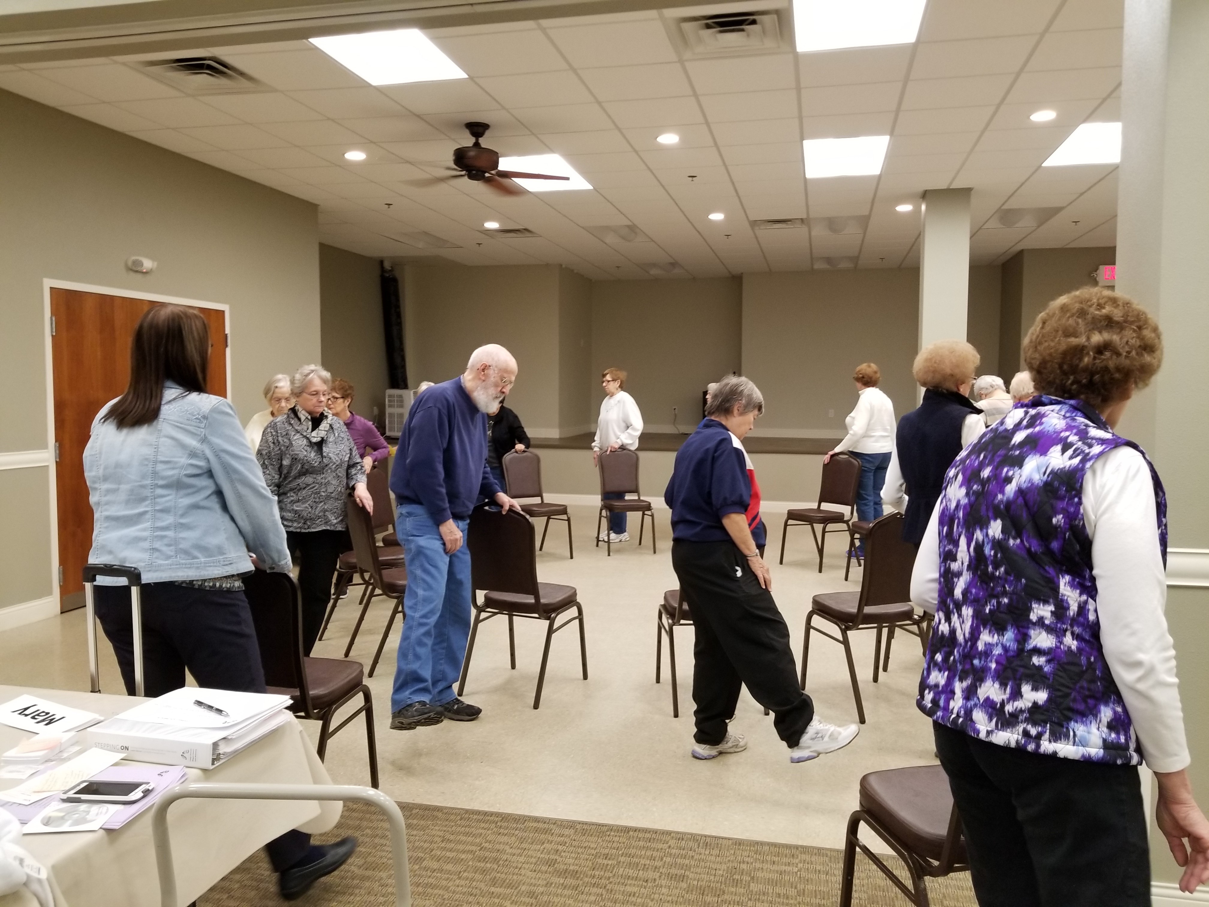 Seniors practice exercises that will help them improve their balance and muscle strength and reduce their risk of falling. (NDSU photo)