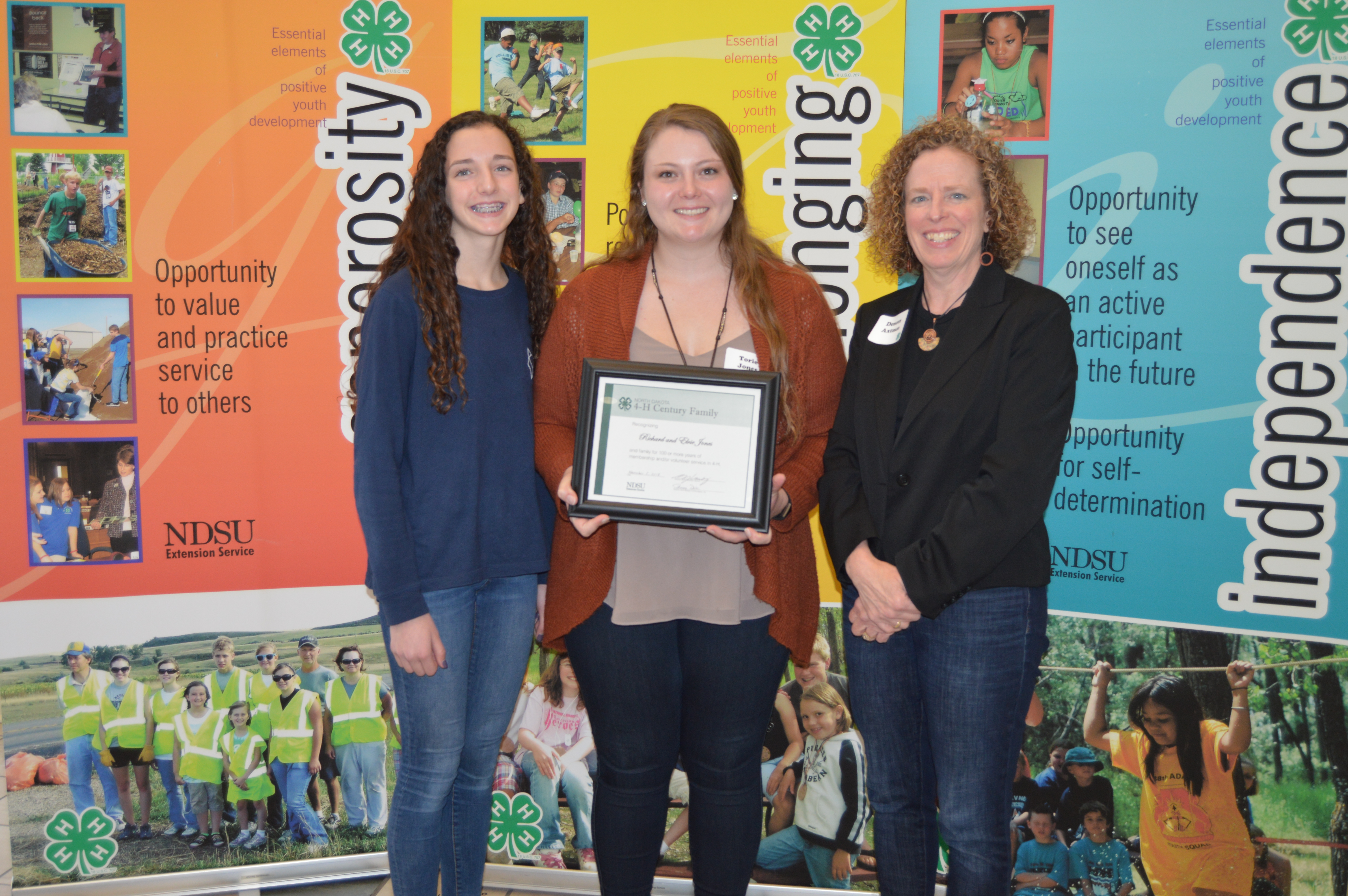 The Richard and Elvie Jones family is recognized as a North Dakota 4-H Century Family. Family members pictured are (from left): Astrid Axtman, Torie Jones and Deneen Axtman. (NDSU photo)https://www.ag.ndsu.edu/news/newsreleases/2018/nov-19-2018/n-d-4-h-century-families-recognized/the-richard-and-elvie-jones-family-is-recognized-as-a-north-dako/viewhttps://www.ag.ndsu.edu/news/newsreleases/2018/nov-19-2018/n-d-4-h-century-families-recognized/the-richard-and-elvie-jones-family-is-recognized-as-a-north-dako/@@download/image/2018-11-24.3189632549