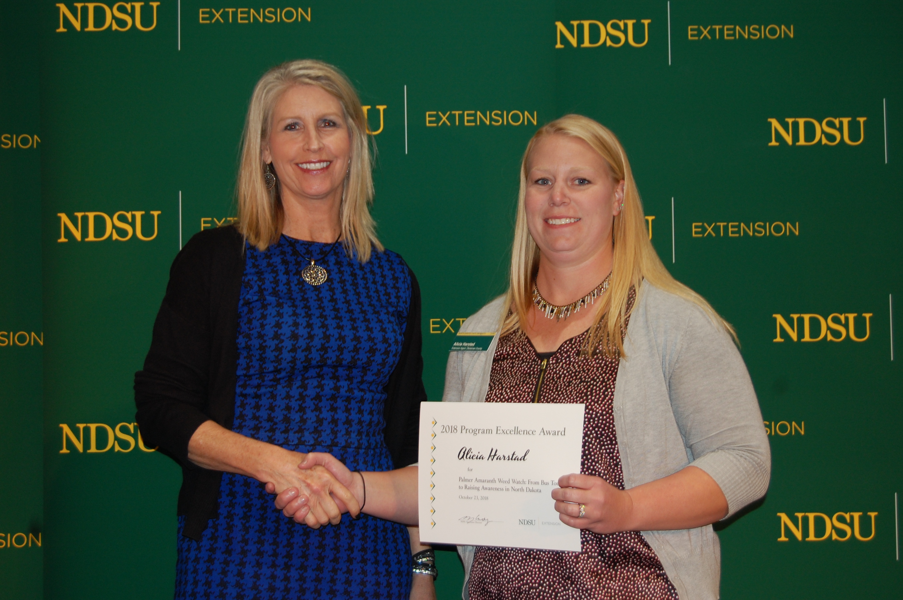 Alicia Harstad, right, receives an Extension Program Excellence Award. (NDSU photo) https://www.ag.ndsu.edu/news/newsreleases/2018/oct-29-2018/ndsu-extension-teams-honored-for-program-excellence/alicia-harstad-right-receives-an-extension-program-excellence-aw/view https://www.ag.ndsu.edu/news/newsreleases/2018/oct-29-2018/ndsu-extension-teams-honored-for-program-excellence/alicia-harstad-right-receives-an-extension-program-excellence-aw/@@download/image/2018-10-30.9423303742 Alicia Harstad, right, receives an Extension Program Excellence Award. (NDSU photo) Click to view full-size image… Size: 1.5 MB