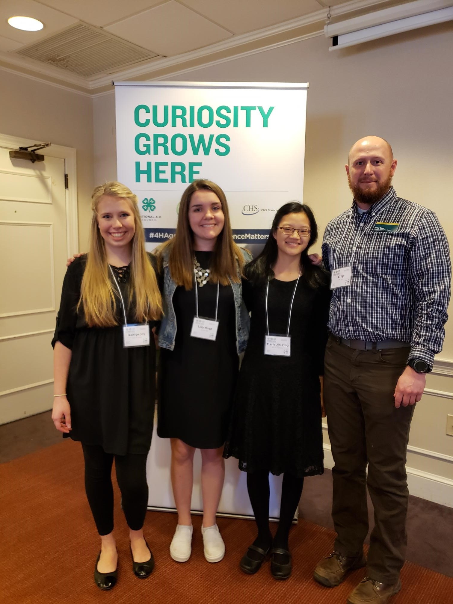 Three North Dakota 4-H'ers were selected to attend the 2019 National Youth Summit on Agri-Science in Chevy Chase, Md. Pictured are (from left) North Dakota delegates Kaitlyn Joerger, Lilly Bina and Marie Kraemer, and their chaperone, Greg Benz, NDSU Extension’s agriculture and natural resources agent in Dunn County. (NDSU photo)