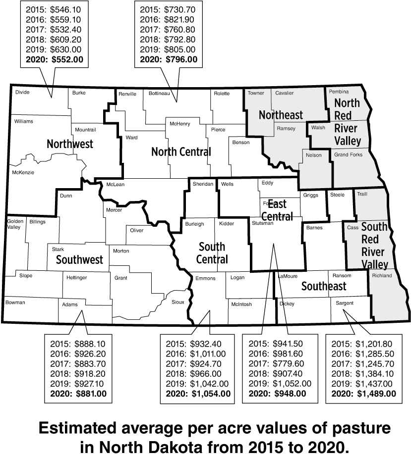 Estimated average per acre values of pasture in North Dakota from 2015 to 2020https://www.ag.ndsu.edu/news/newsreleases/2020/march-30-2020/n-d-pastureland-values-decline-in-2020/estimated-average-per-acre-values-of-pasture-in-north-dakota-fro/viewhttps://www.ag.ndsu.edu/news/newsreleases/2020/march-30-2020/n-d-pastureland-values-decline-in-2020/estimated-average-per-acre-values-of-pasture-in-north-dakota-fro/@@download/image/2020-04-03.2877388172