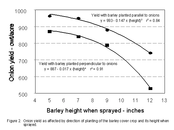 High winds, which occur frequently in the spring time in North Dakota, blow soil particles from the finely prepared onion seedbed across the ground, causing extensive damage to newly emerged onion plants. One way of stopping the destruction is by planting a cover crop. In this study a cover crop of barley was drilled just before the onions were planted. Onions were planted either perpendicular to or parallel with the rows of barley. The barley was then killed with Fusilade at different heights and data collected to determine the effect of the cover crop on onion production.