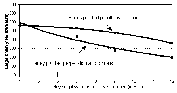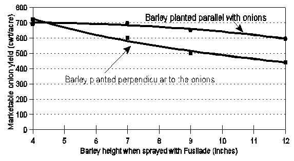 This was the fourth year we conducted studies on barley as a cover crop in onions. The general trend was for yields to decrease the longer the barley was allowed to grow before killing it. Yield decreased slowly (usually not significantly) until a barley height of 6 to 7 inches, then decreased more rapidly as the barley grew taller. The decrease was more pronounced when barley was planted perpendicular than when it was planted parallel to the onion rows (See Figures 2 and 3). Onion height was less, onion growth stage was retarded, and percent ground cover from the residue barley increased the longer the barley was allowed to grow. The total number of onion bulbs harvested did not change, but yield decreased due to smaller bulbs as barley height at spraying increased. Our recommendation is to plant the barley cover crop parallel with the onions. We modified a Stanhay vegetable planter by mounting a grain drill on top of it and closing some of the grain outlets so barley was drilled only between onion rows and never in the same row as the onions. This worked very well for us. We also recommend spraying the barley to kill it when it is about six inches tall. This protects the onions from most wind damage and has little, if any, effect on yield.