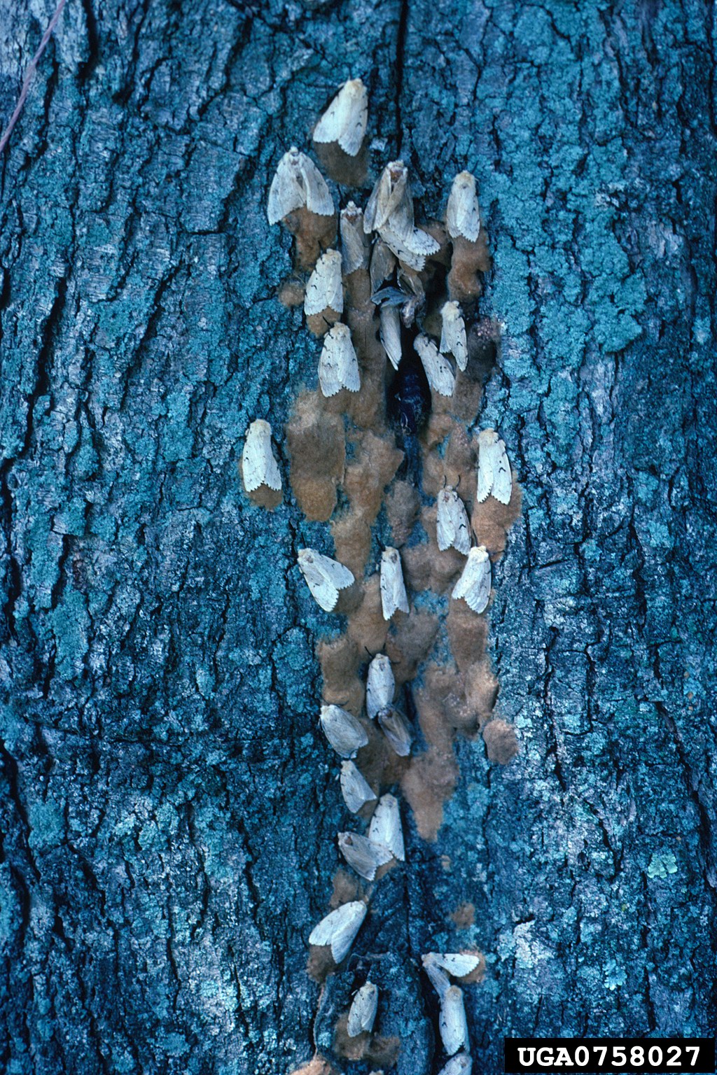 Adult female gypsy moths and brown egg masses